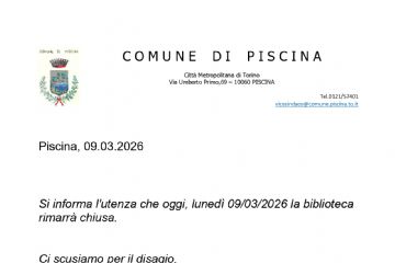 Si informa l'utenza che oggi, lunedì 09/03/2026 la biblioteca rimarrà chiusa. Ci scusiamo per il disagio.