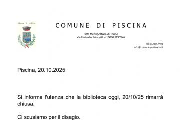 Si informa l'utenza che la biblioteca oggi, 20/10/25 rimarrà chiusa.