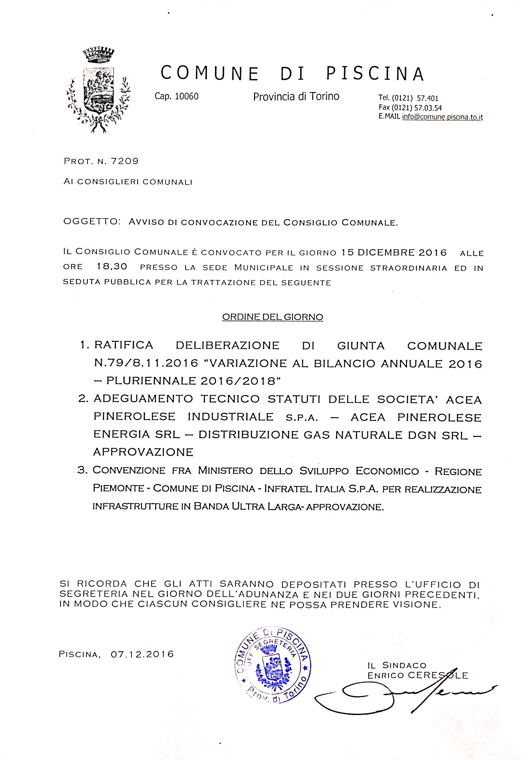 CONVOCAZIONE DEL CONSIGLIO COMUNALE CON INTEGRAZIONE ALL'ORDINE DEL GIORNO