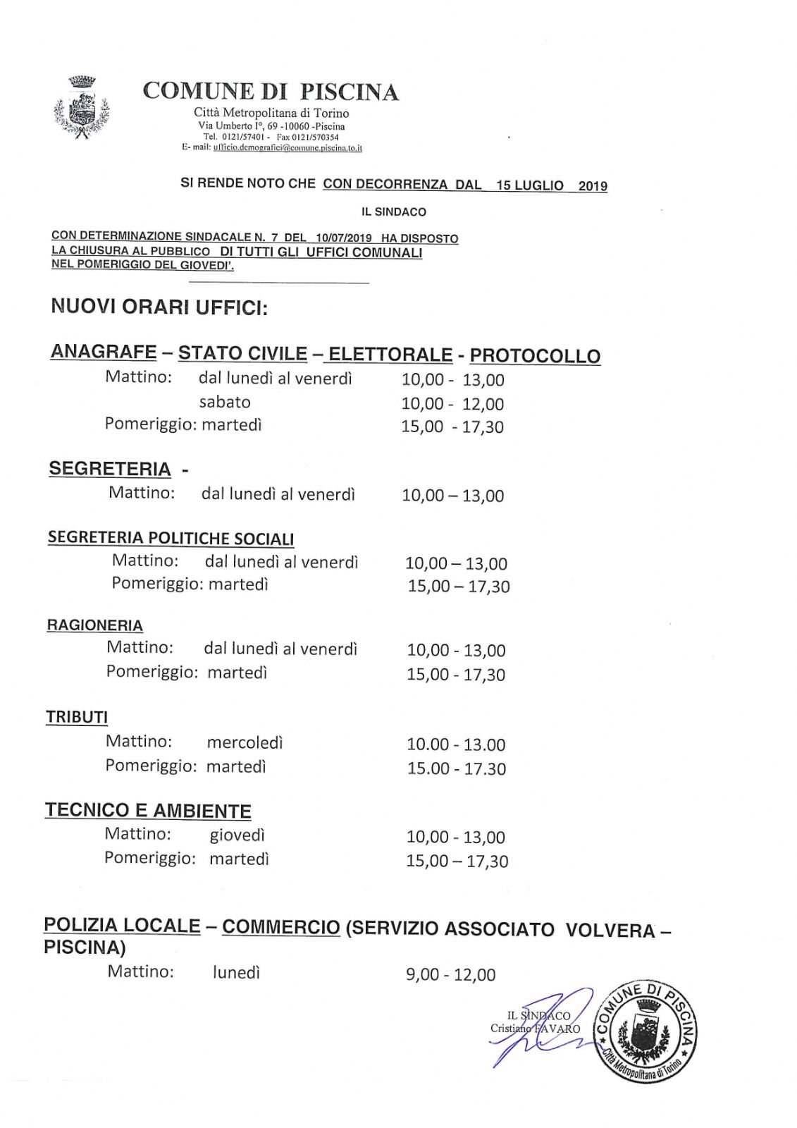 ORARI UFFICI COMUNALI DAL 15 LUGLIO 2019