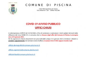 In ottemperanza al DPCM del 13/10/2020, al fine di contenere e contrastare i rischi sanitari derivanti dalla diffusione del virus COVID-19, si comunica che la chiusura degli uffici del Comune di...