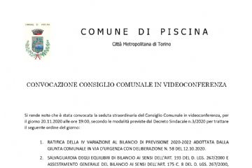 Il Consiglio Comunale è convocato per venerdi' 20 novembre 2020 alle ore 19:00 in modalità videoconferenza.
