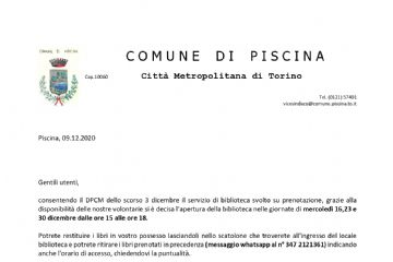 consentendo il DPCM dello scorso 3 dicembre il servizio di biblioteca svolto su prenotazione, grazie alla disponibilità delle nostre volontarie si è decisa l'apertura della...