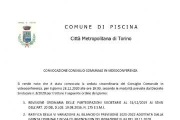 Il Consiglio Comunale è convocato per LUNEDI' 28 DICEMBRE 2020 alle ore 19:00 in modalità videoconferenza.