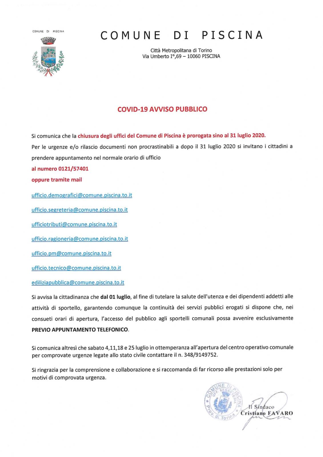 Proroga chiusura uffici comunali sino al 31.07.2020