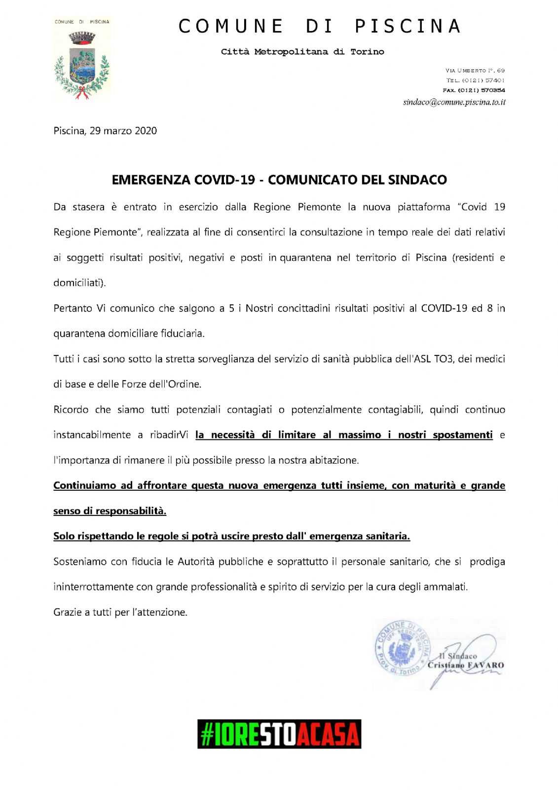 Aggiornamento situazione emergenza epidemiologica da COVID-19 per il Comune di Piscina