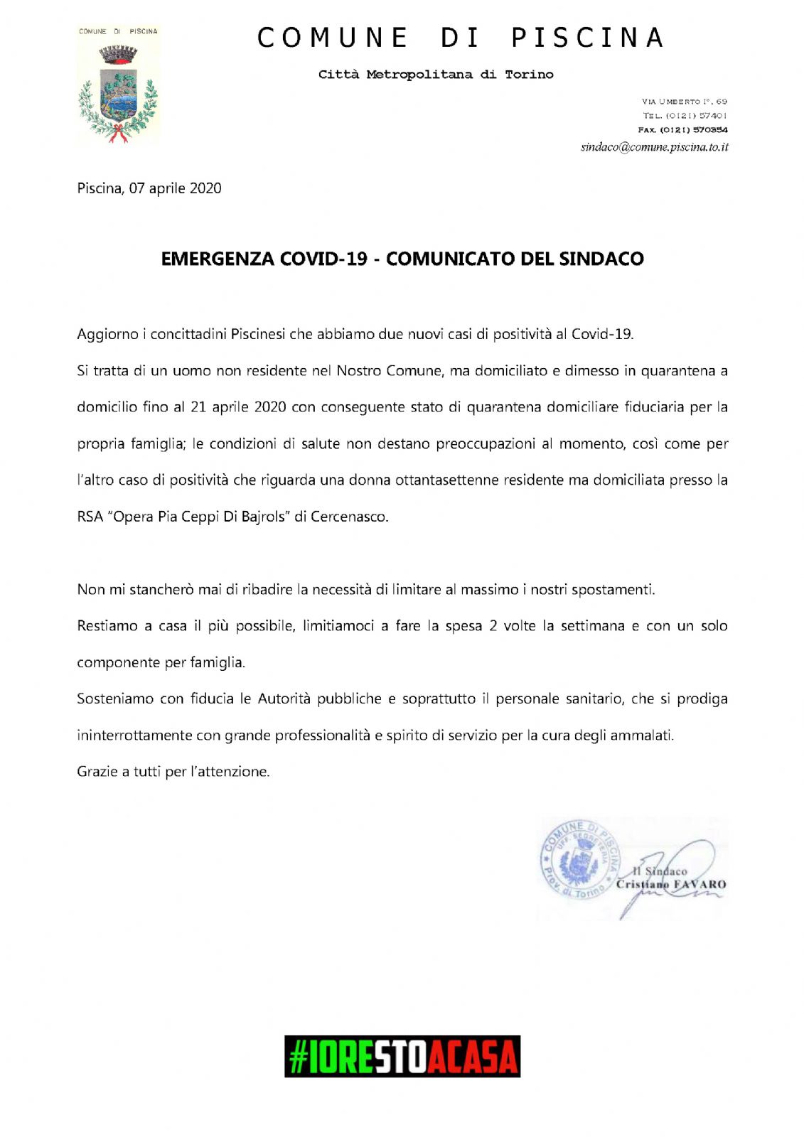 Aggiornamento situazione emergenza epidemiologica da COVID-19 per il Comune di Piscina