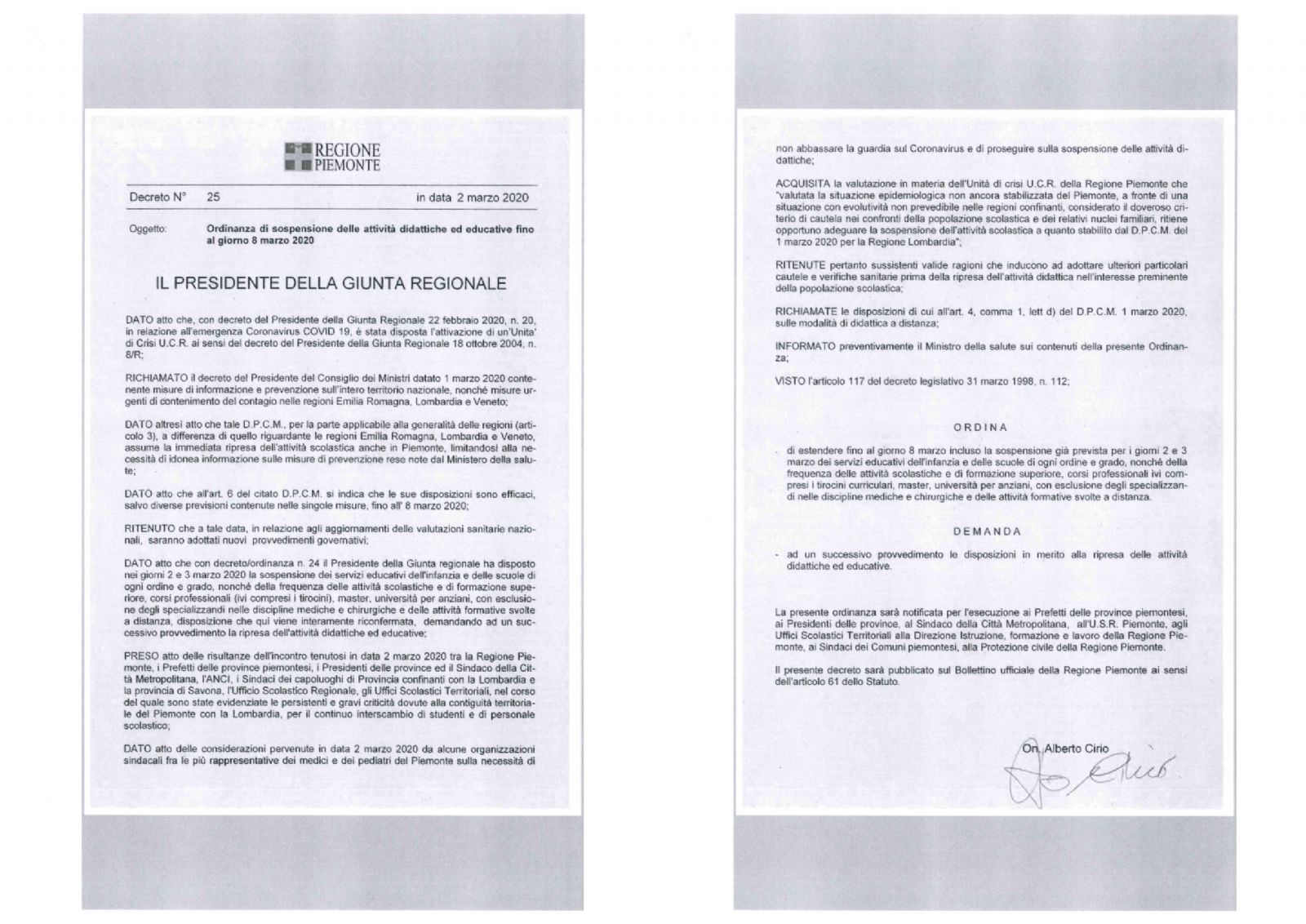 Ordinanza di sospensione delle attivita' didattiche ed educative fino al giorno 8 marzo 2020