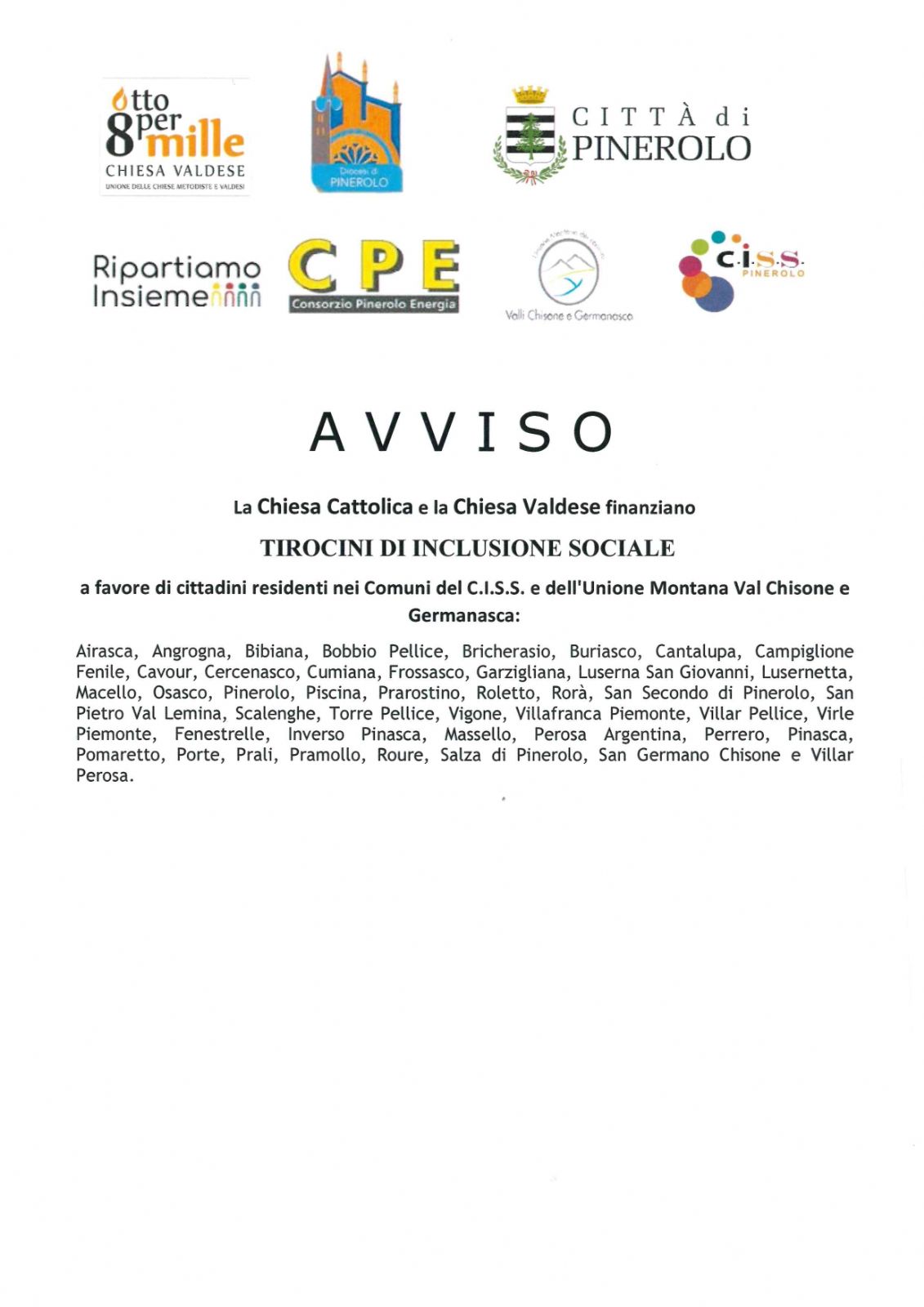 La Chiesa Cattolica e la Chiesa Valdese finanziano TIROCINI DI INCLUSIONE SOCIALE a favore dei cittadini residenti nei Comuni del C.I.S.S. e dell’Unione Montana Val Chisone e Germanasca.