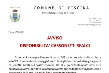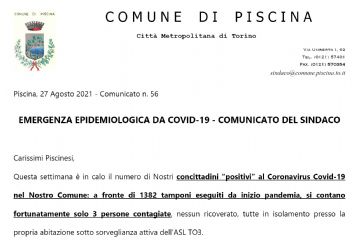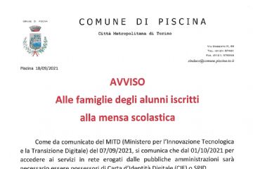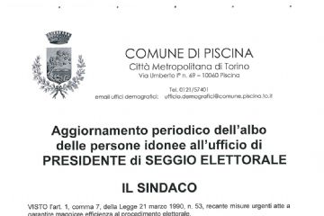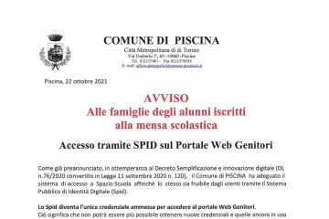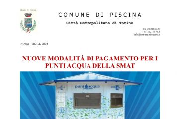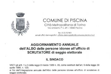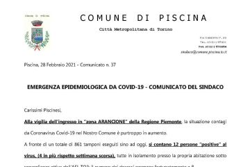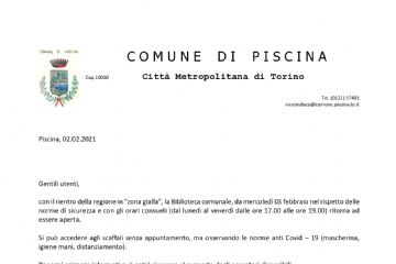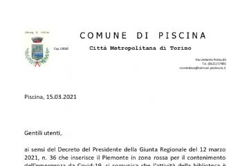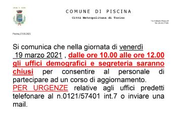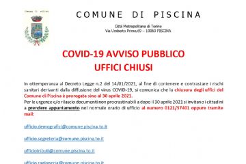 In ottemperanza al D.L. 2/2021, al fine di contenere e contrastare i rischi sanitari derivanti dalla diffusione del virus COVID-19, si comunica che la chiusura degli uffici del Comune di Piscina è...