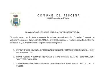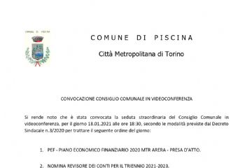 Il Consiglio Comunale è convocato per LUNEDI' 18 GENNAIO 2021 alle ore 18:30 in modalità videoconferenza.