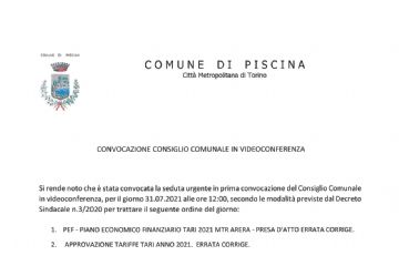 Il Consiglio Comunale è convocato per SABATO 31 LUGLIO 2021 alle ore 12:00 in modalità videoconferenza.