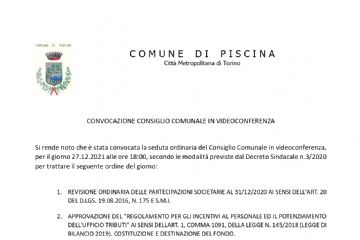Il Consiglio Comunale è convocato per LUNEDI' 27 DICEMBRE 2021 alle ore 18.00 in modalità videoconferenza.