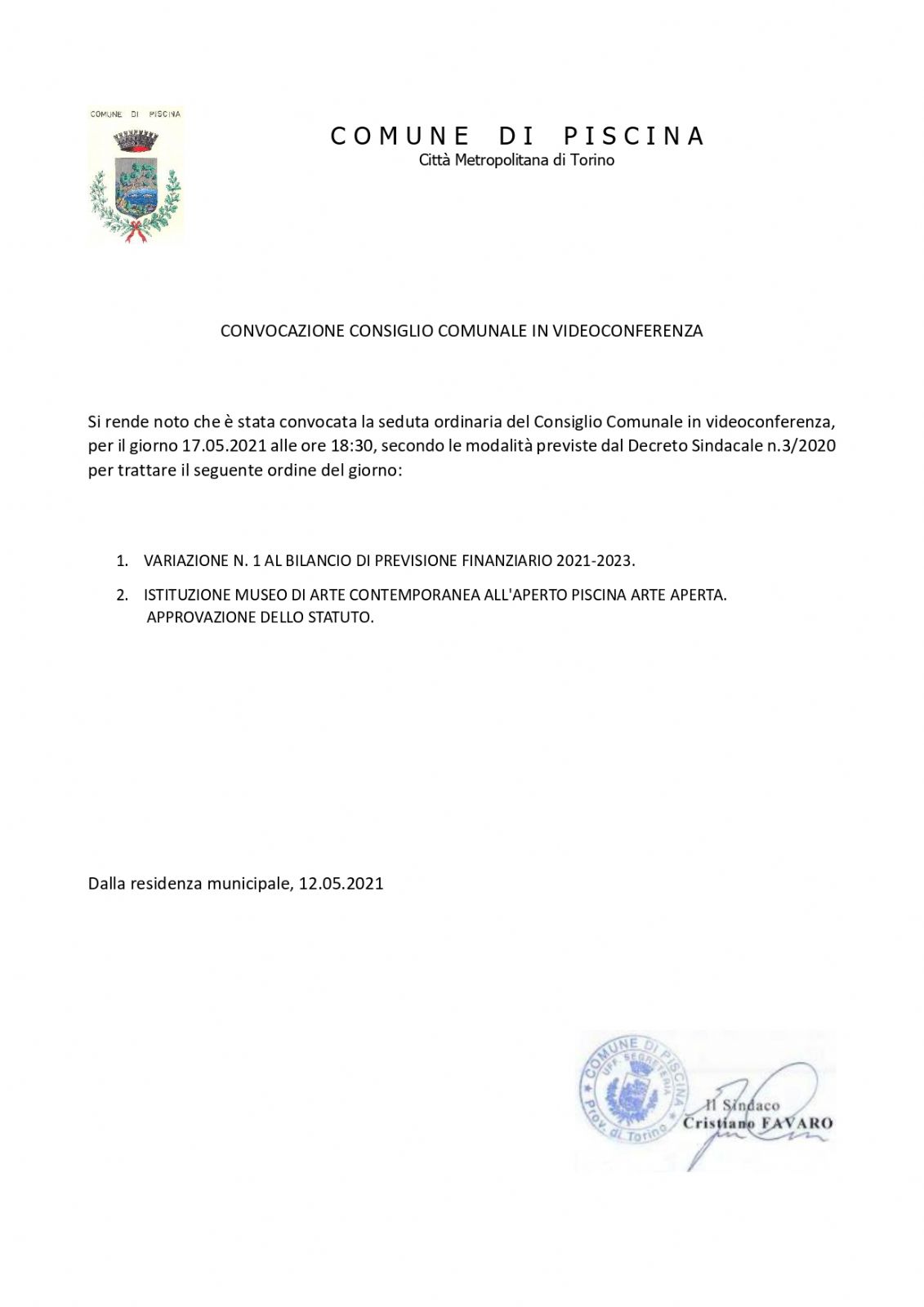 Il Consiglio Comunale è convocato per LUNEDI' 17 MAGGIO 2021 alle ore 18:30 in modalità videoconferenza.