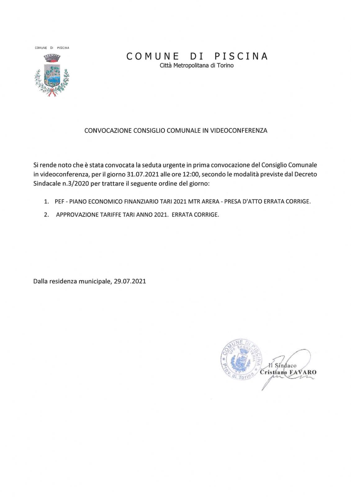 Il Consiglio Comunale è convocato per SABATO 31 LUGLIO 2021 alle ore 12:00 in modalità videoconferenza.