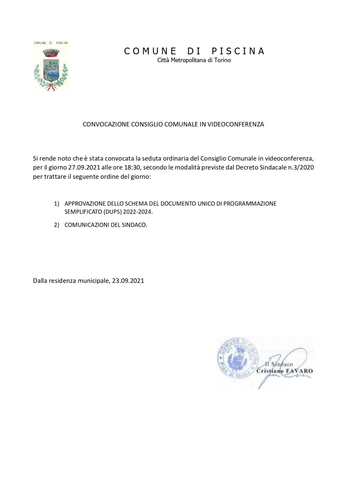 Il Consiglio Comunale è convocato per LUNEDI' 27 SETTEMBRE 2021 alle ore 18:30 in modalità videoconferenza.