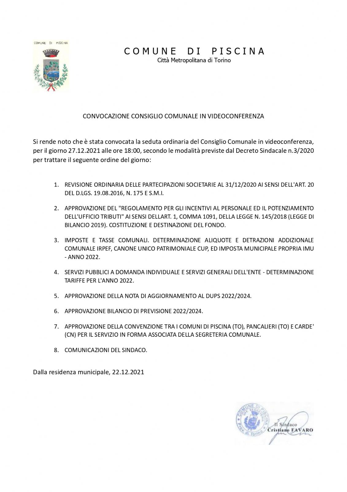 Il Consiglio Comunale è convocato per LUNEDI' 27 DICEMBRE 2021 alle ore 18.00 in modalità videoconferenza.