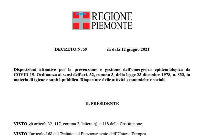 inviamo in allegato l'ordinanza assunta dal Presidente Cirio, attraverso la quale si dispongono anche in Piemonte le misure per la "zona bianca" a partire da lunedì 14 giugno 2021.