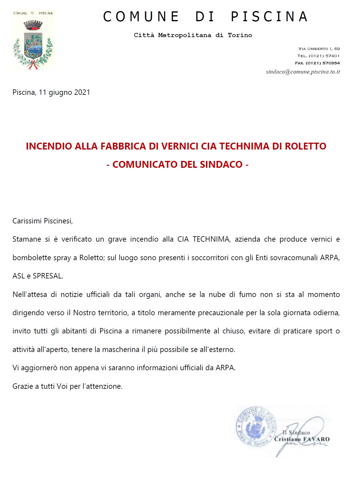 Incendio alla fabbrica di vernici Via Technima di Roletto - comunicato del sindaco -