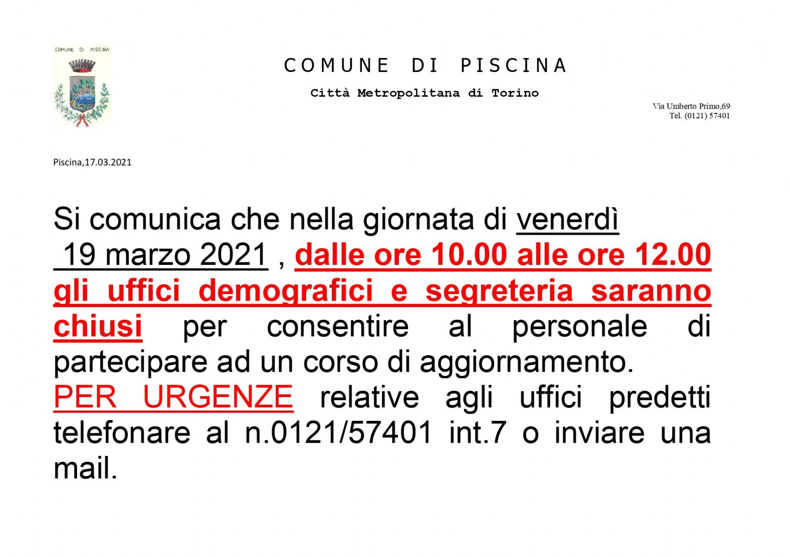 Uffici demografici e segreteria chiusi dalle ore 10.00 alle ore 12.00 per corso di aggiornamento.