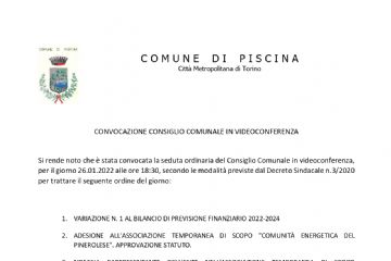 Il Consiglio Comunale è convocato per MERCOLEDI' 26 GENNAIO 2022 alle ore 18.30 in modalità videoconferenza.