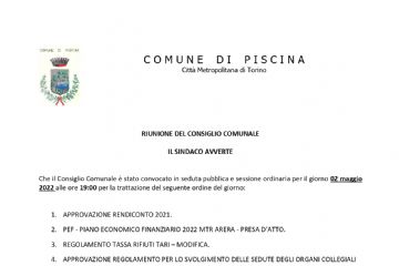 Il Consiglio Comunale è convocato in presenza LUNEDI' 02 MAGGIO 2022 alle ore 19.00.