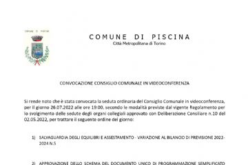 Il Consiglio Comunale è convocato per MARTEDI' 26 LUGLIO 2022 alle ore 19.00 in modalità videoconferenza.