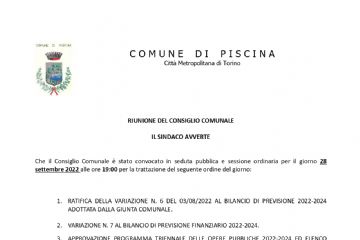 Il Consiglio Comunale è convocato in presenza MERCOLEDI' 28 SETTEMBRE 2022 alle ore 19.00.