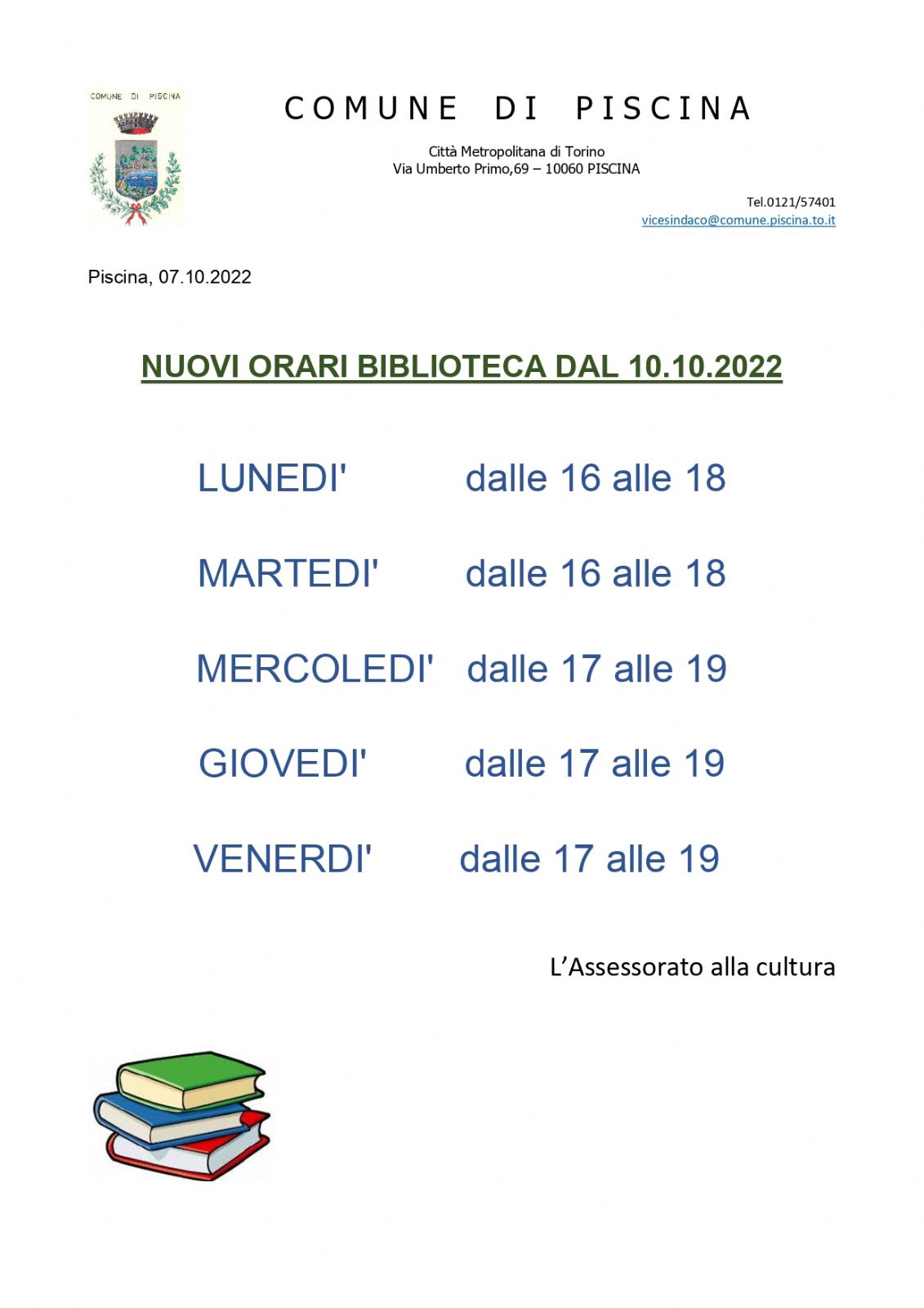 Nuovi orari della Biblioteca Comunale da lunedì 10 ottobre 2022.