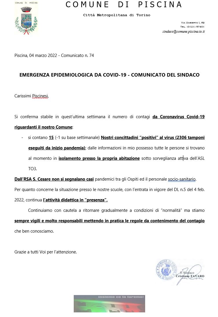 Aggiornamento situazione epidemiologica da Covid-19 per la popolazione del Comune di Piscina