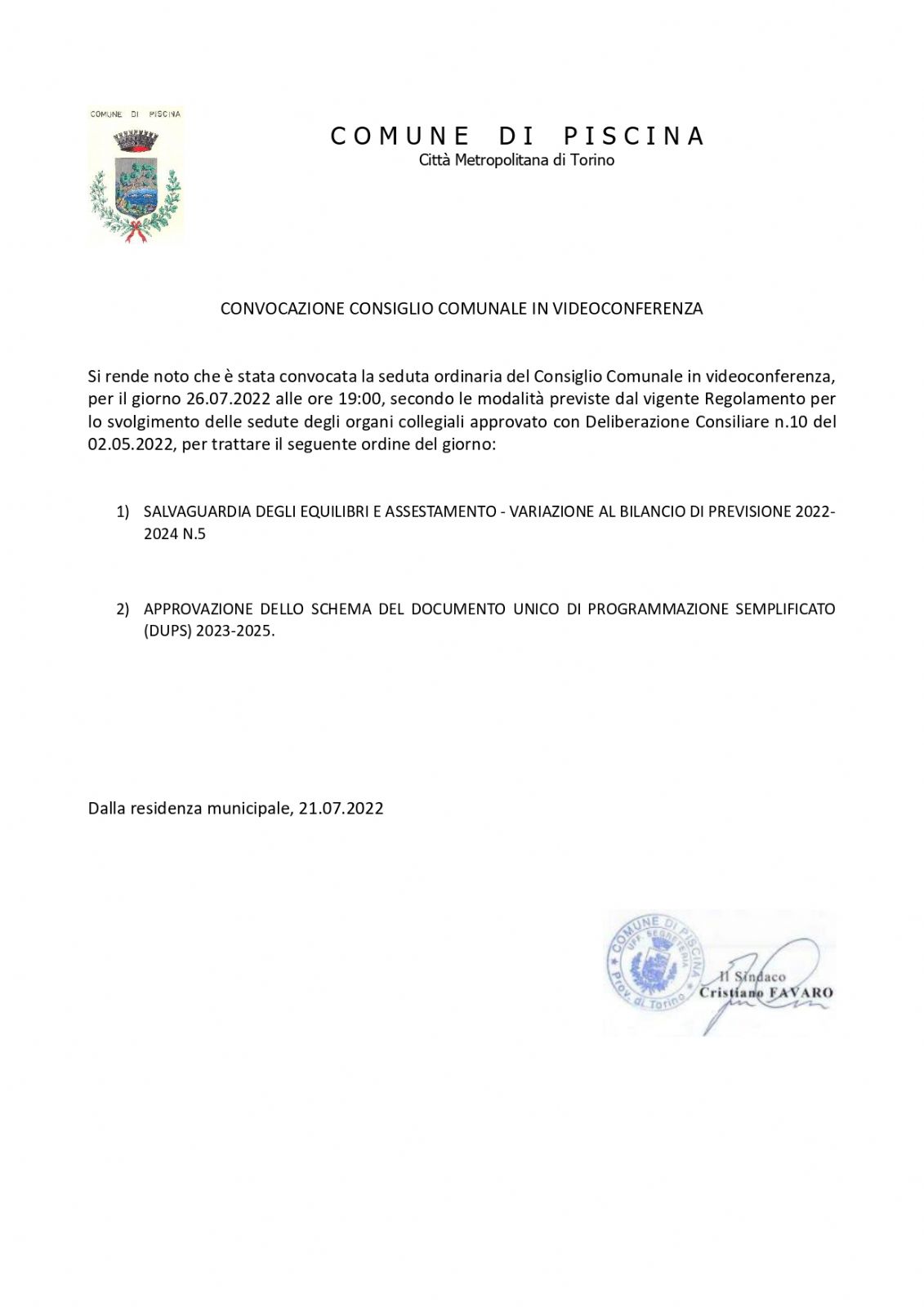 Il Consiglio Comunale è convocato per MARTEDI' 26 LUGLIO 2022 alle ore 19.00 in modalità videoconferenza.