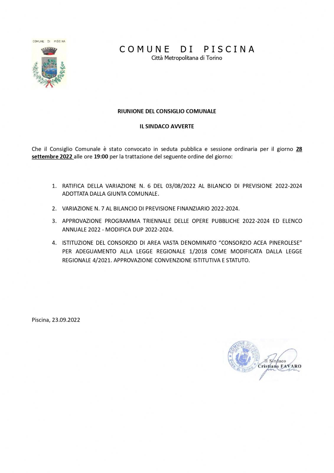 Il Consiglio Comunale è convocato in presenza MERCOLEDI' 28 SETTEMBRE 2022 alle ore 19.00.