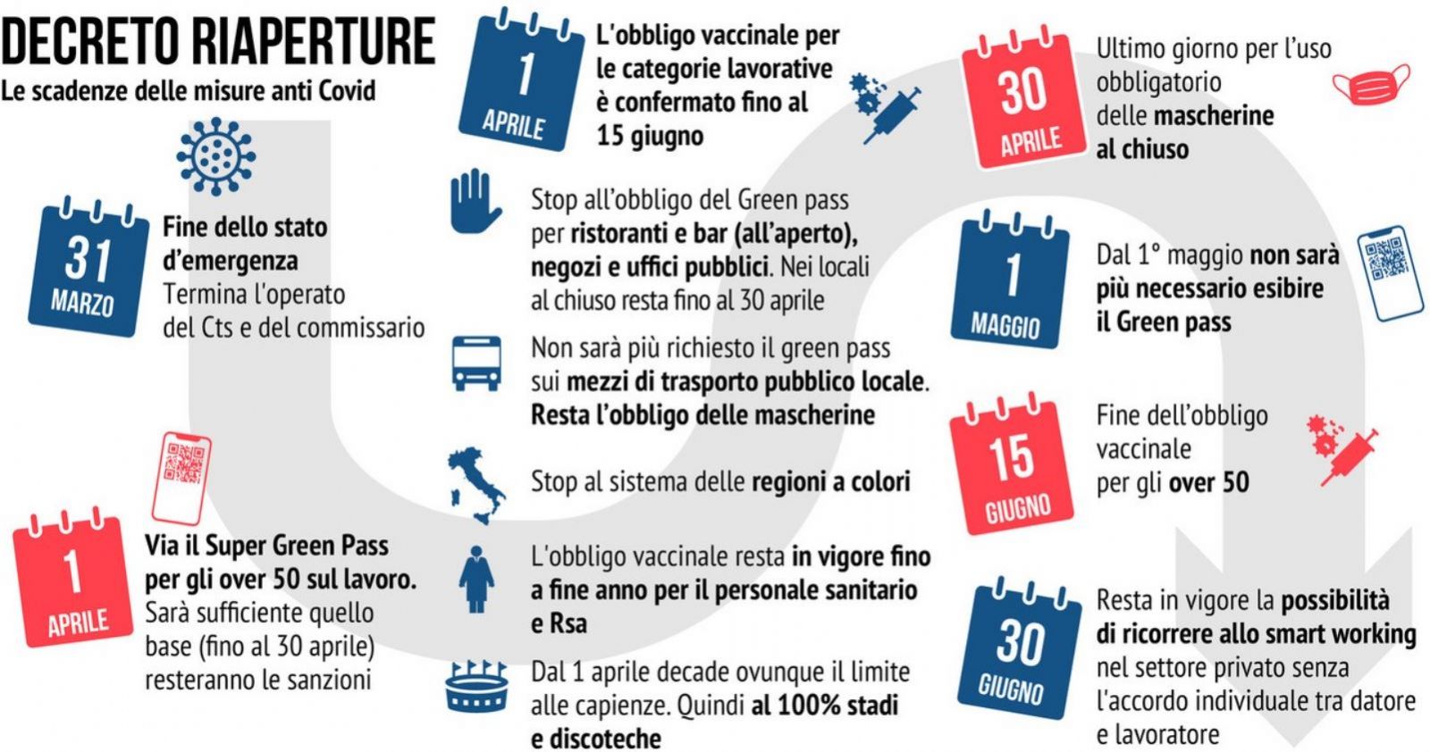 Il Consiglio dei Ministri del 17 marzo 2022 ha approvato un decreto legge per il superamento delle misure di contrasto alla diffusione dell'epidemia da Covid 19, dal mese di aprile, dopo la cessazione dello stato di emergenza.