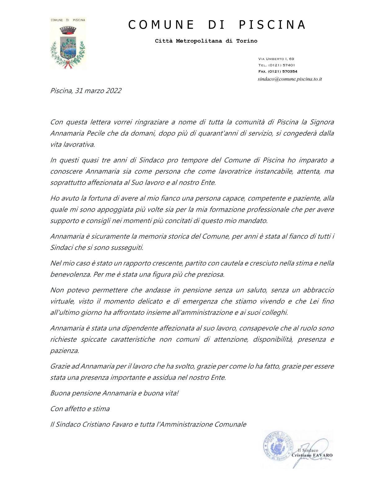 I ringraziamenti dell'Amministrazione comunale alla Sig.ra Annamaria Pecile in pensione dopo più di quarantadue anni di servizio