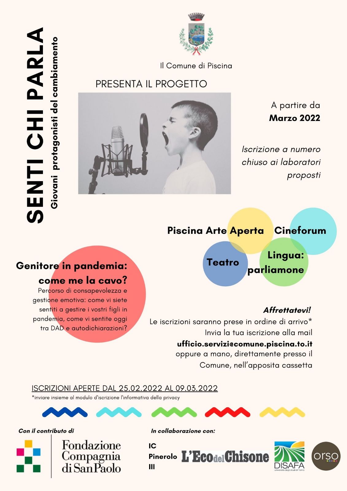 Grazie al progetto "Senti chi parla? Giovani protagonisti del cambiamento", si intraprenderanno a partire dal mese di marzo nuovi laboratori (piscina arte aperta: disegno, teatro, cineforum, lingua: parliamone)