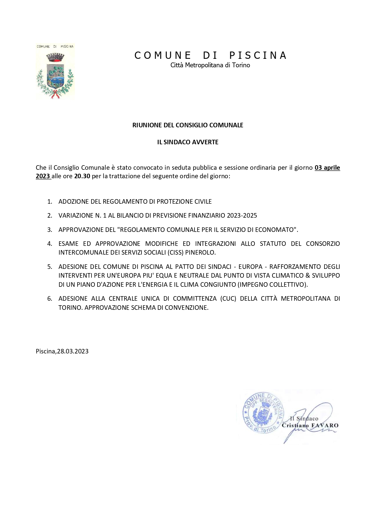 Il Consiglio Comunale è convocato in presenza LUNEDI' 03 APRILE 2023 alle ore 20.30