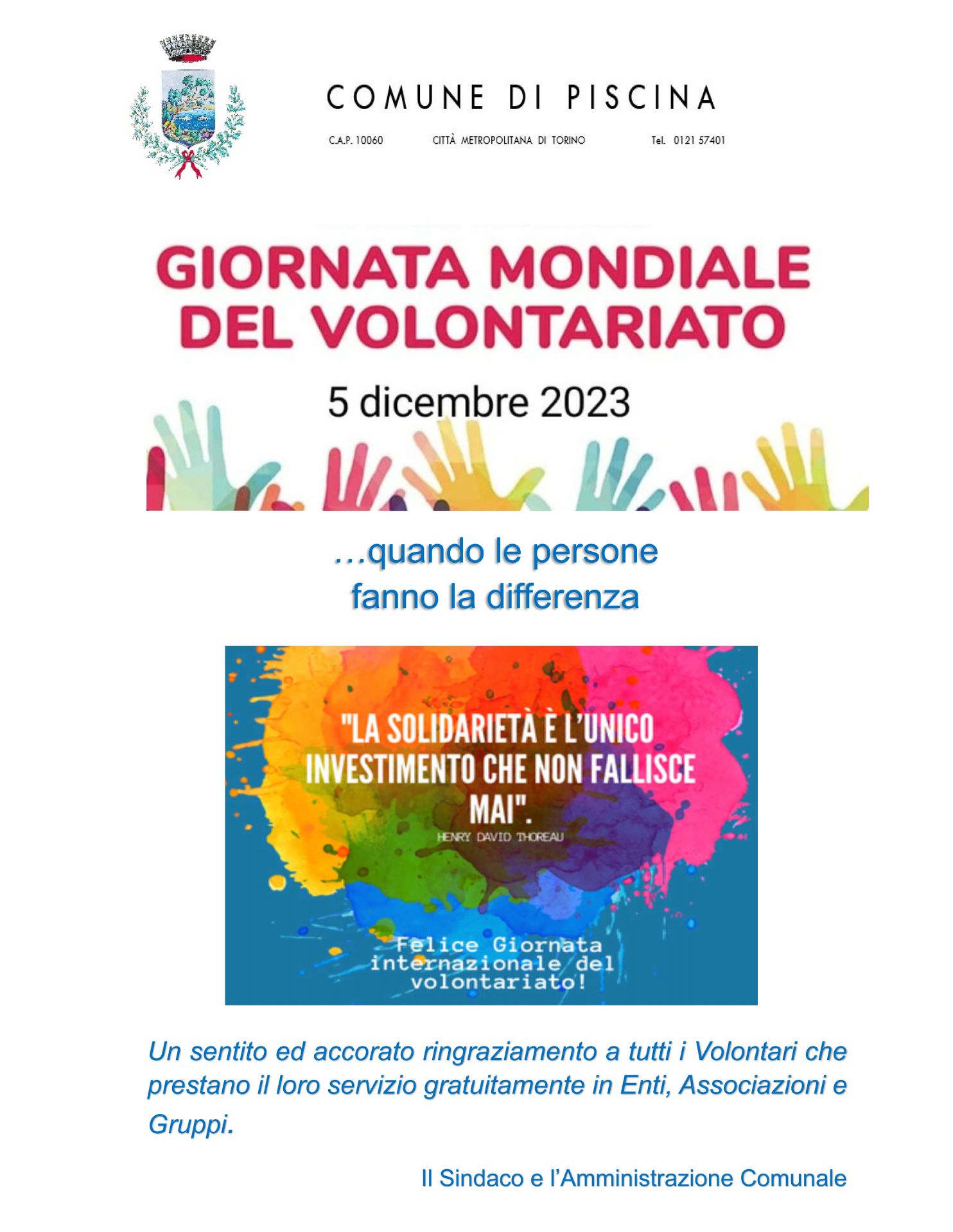 Un sentito ed accorato ringraziamento a tutti i Volontari che prestano il loro servizio gratuitamente in Enti, Associazioni e Gruppi.