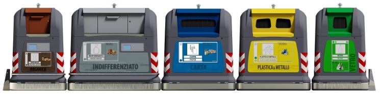 Il cassonetto della plastica/metallo (giallo) del vetro (verde) e della carta (blu) rimarranno invariati con apertura libera.