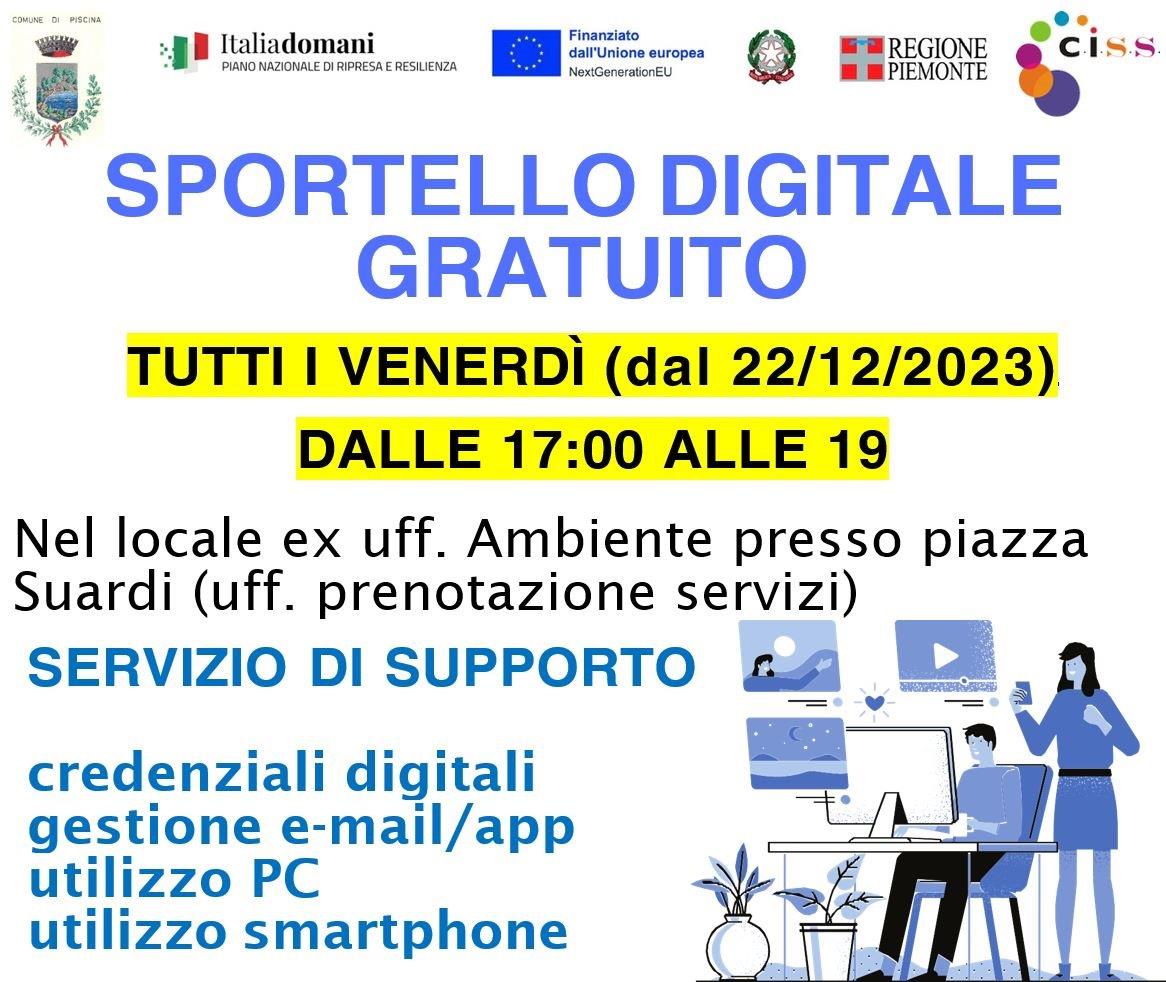 Dal 22/12/2023 tutti i venerdì dalle ore 17 alle ore 19 sarà attivo presso il locale ex uff. Ambiente (di fronte all'entrata del Comune) lo Sportello Digitale Gratuito, messo a disposizione dei cittadini per aiutare tutti coloro che hanno difficoltà con la tecnologia, senza limiti di età o di conoscenze.
