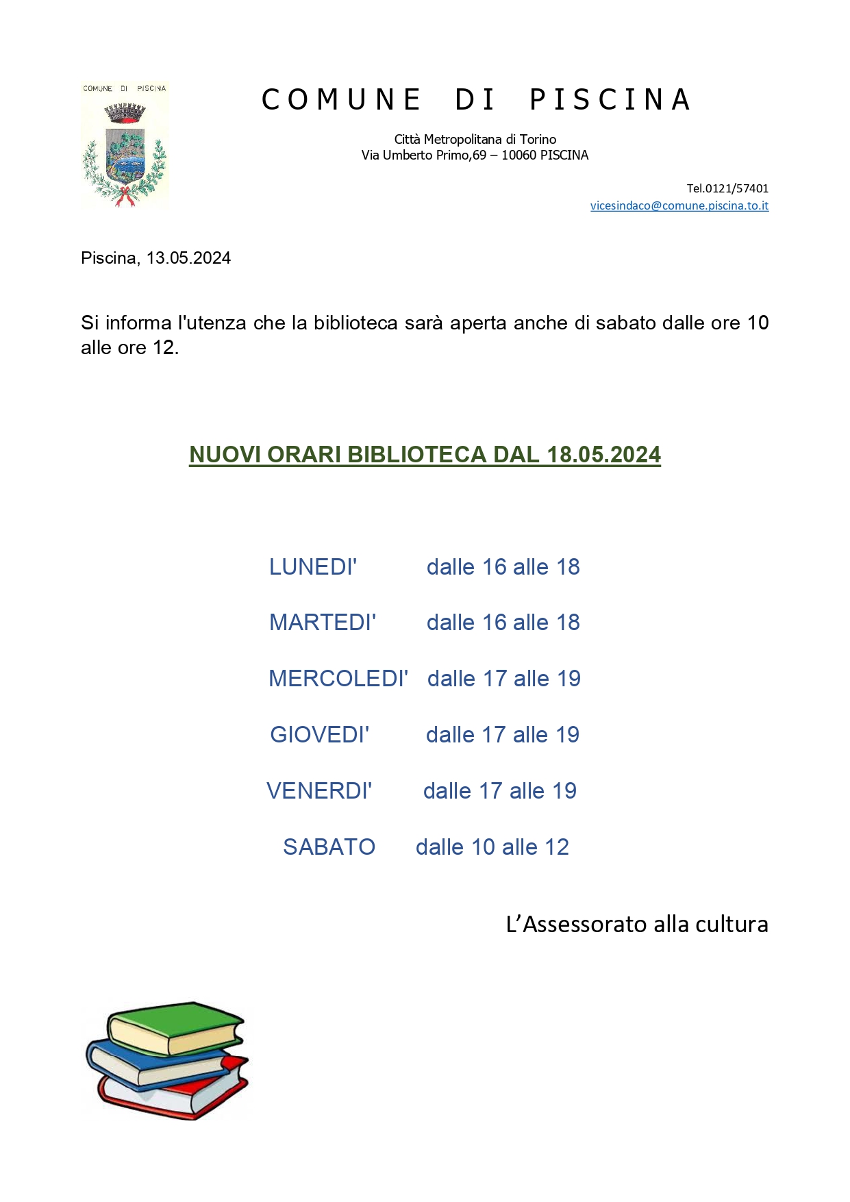 Si informa l'utenza che la biblioteca sarà aperta anche di sabato dalle ore 10 alle ore 12.