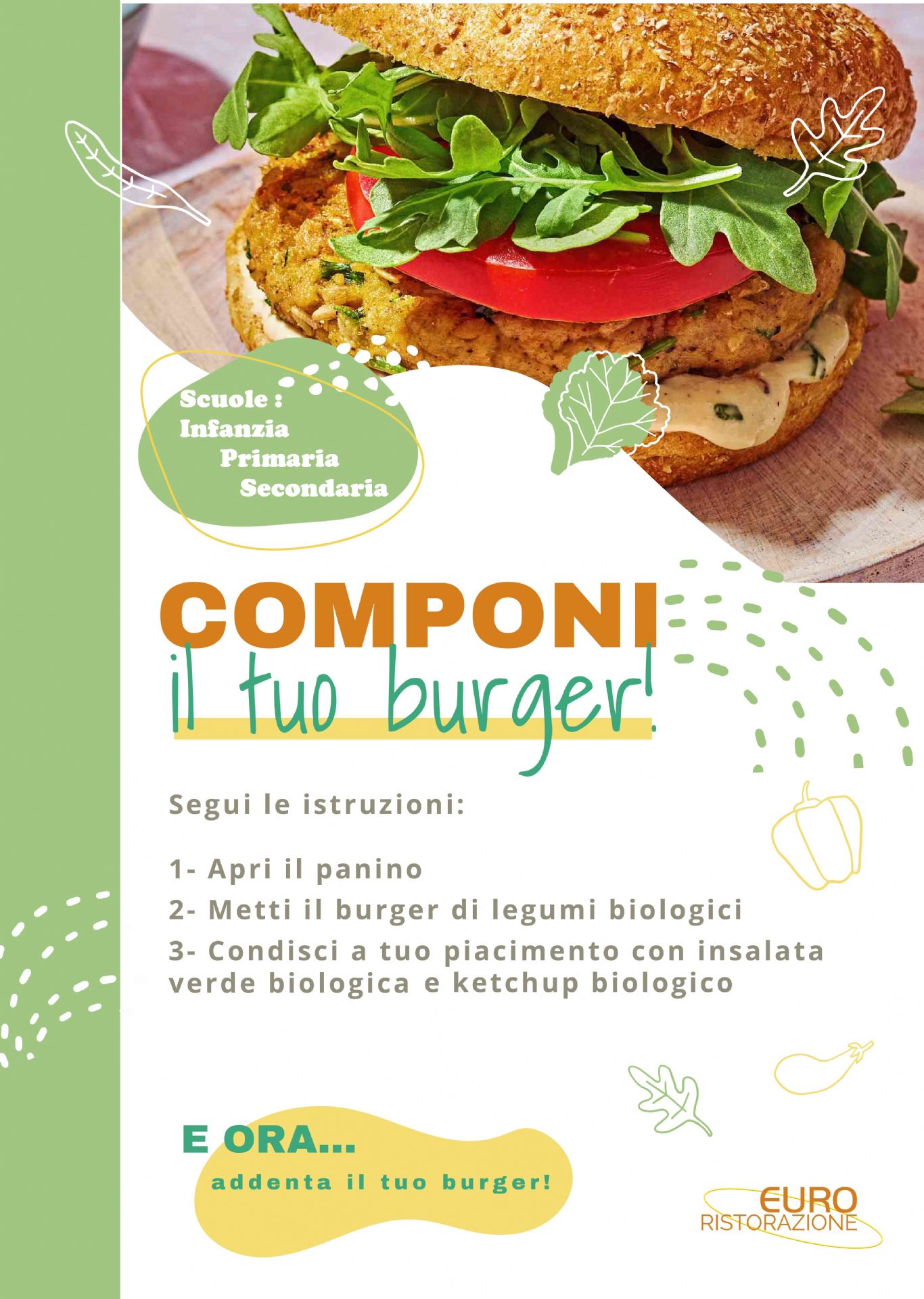 Oggi la Ditta Euroristorazione ci ha comunicato che sarà la giornata del panino con il burger insalata e ketchup, proposta per incentivare i bambini e ragazzi al consumo dei legumi, seguendo le indicazioni della Regione Piemonte sulla riduzione del consumo di proteine animali favorendo quelle vegetali.