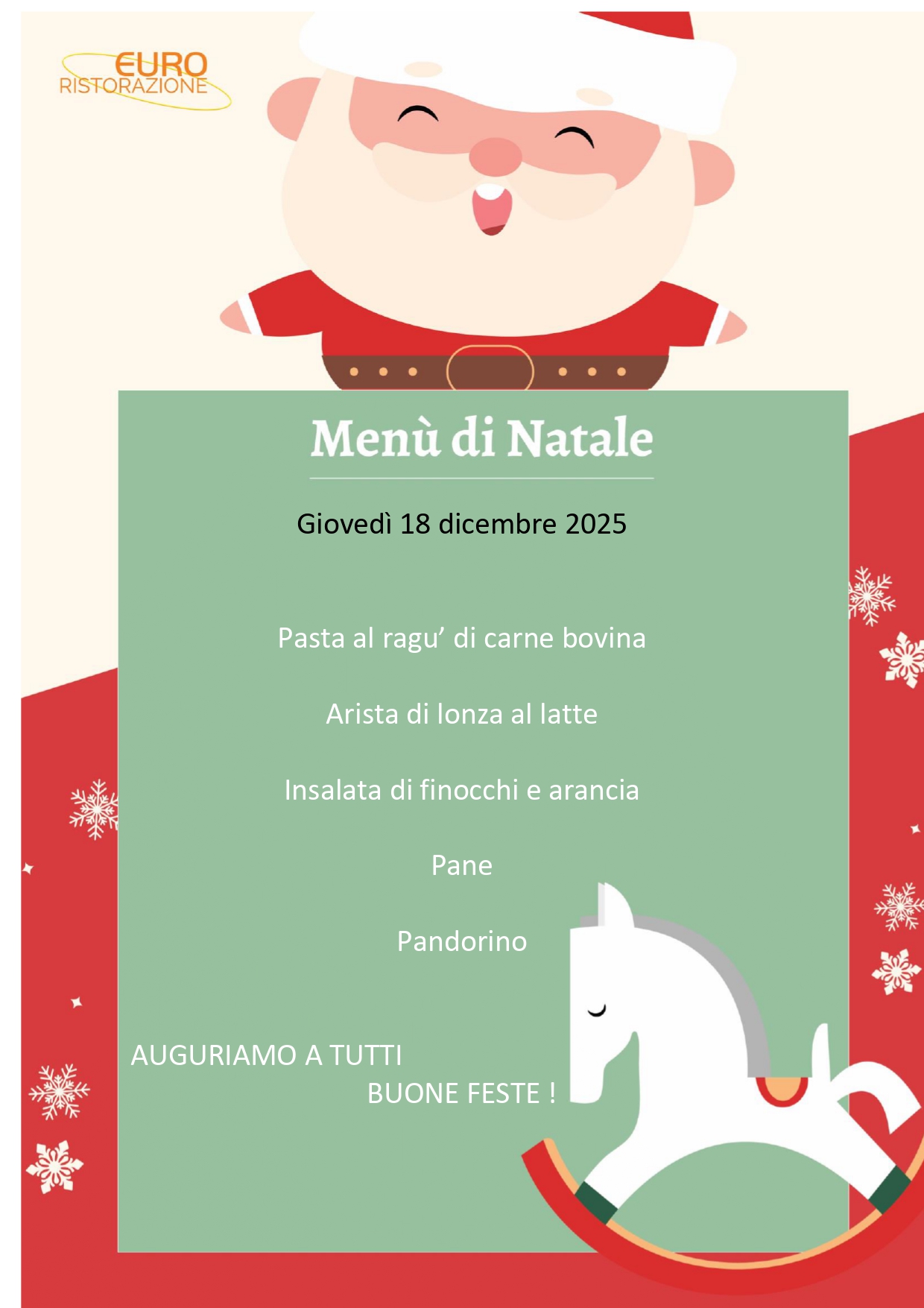 La Ditta Euroristorazione ha previsto di servire il Menù di Natale il giorno giovedì 18 dicembre 2025, giorno in cui vi è il numero massimo di affluenza nelle scuole.