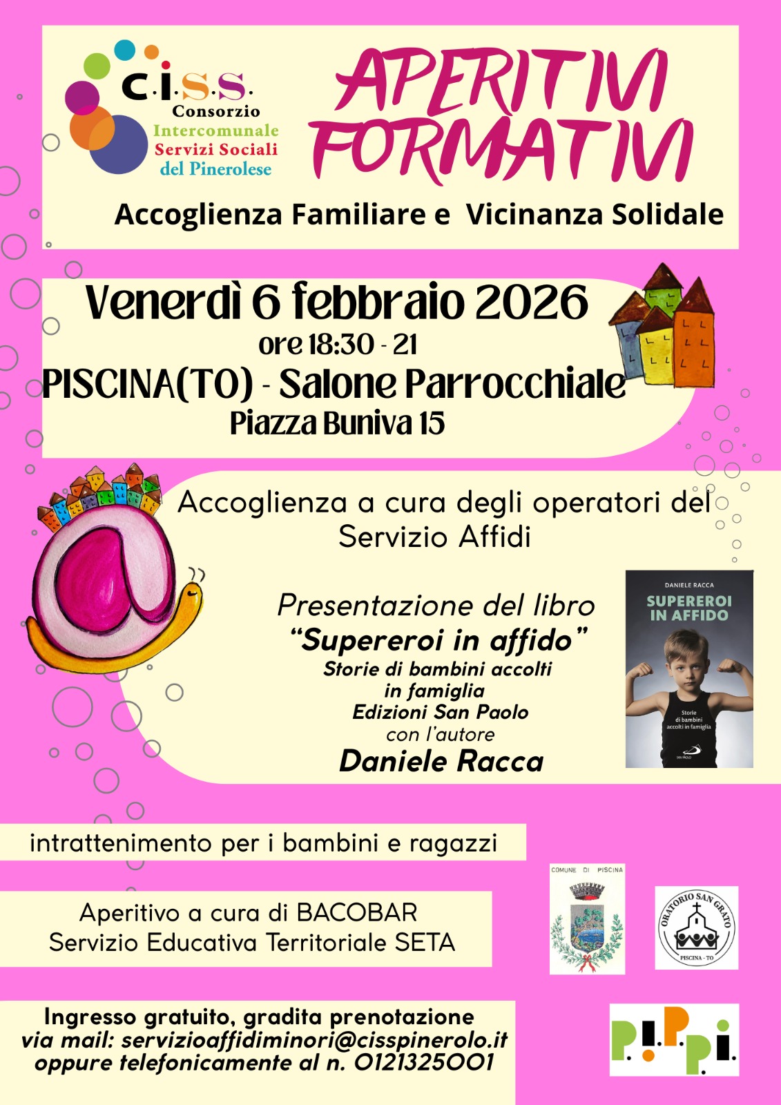 Si informa la cittadinanza che venerdì 6 febbraio 2026, dalle ore 18.30 alle ore 21.00, presso il Salone Parrocchiale di Piscina, in Piazza Buniva n. 15, si terrà l’iniziativa "Aperitivo Formativo – Accoglienza Familiare e Vicinanza Solidale”, promossa dal C.I.S.S. – Consorzio Intercomunale Servizi Sociali del Pinerolese.