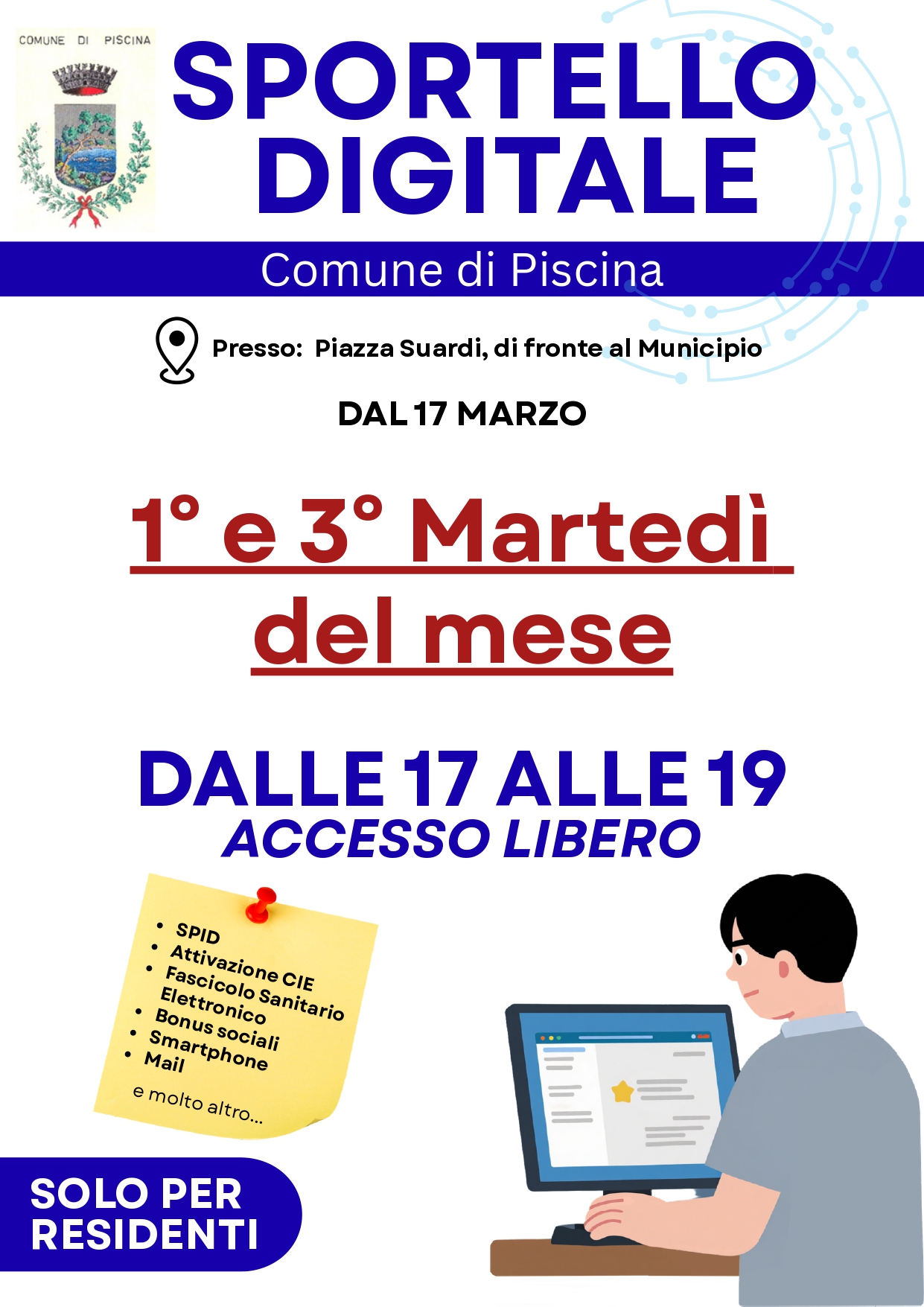 Lo sportello sarà attivo dal 17 marzo 2026 - accesso libero - solo per residenti - il 1° e il 3° Martedì del mese dalle ore 17 alle ore 19 presso Piazza Suardi, di fronte al Municipio.