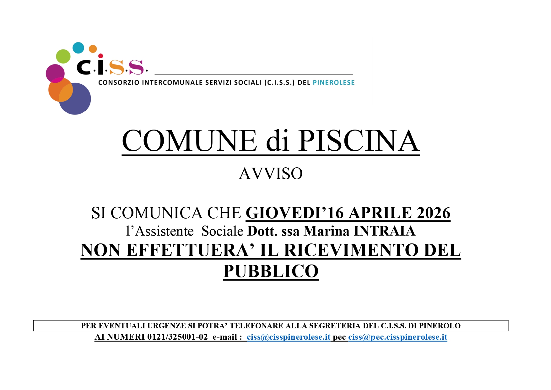 Si comunica che Giovedi’ 16 Aprile 2026 il previsto ricevimento del pubblico dell’Assistente Sociale Dott.ssa Marina Intraia, non verrà effettuato.
