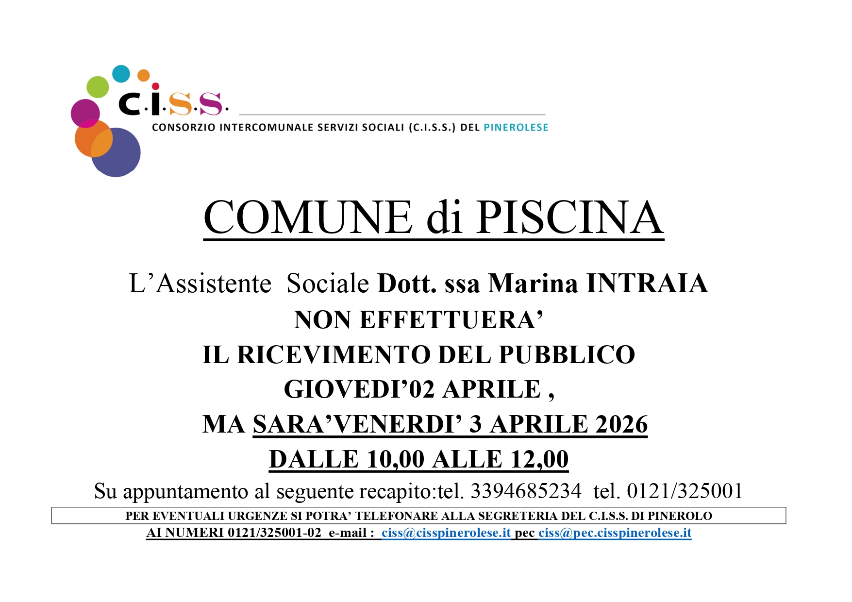 Si comunica che il ricevimento del pubblico dell’Assistente Sociale Dott.ssa Marina Intraia verrà effettuato venerdì 3 Aprile e non giovedì 2 Aprile (con orario 10.00-12.00).