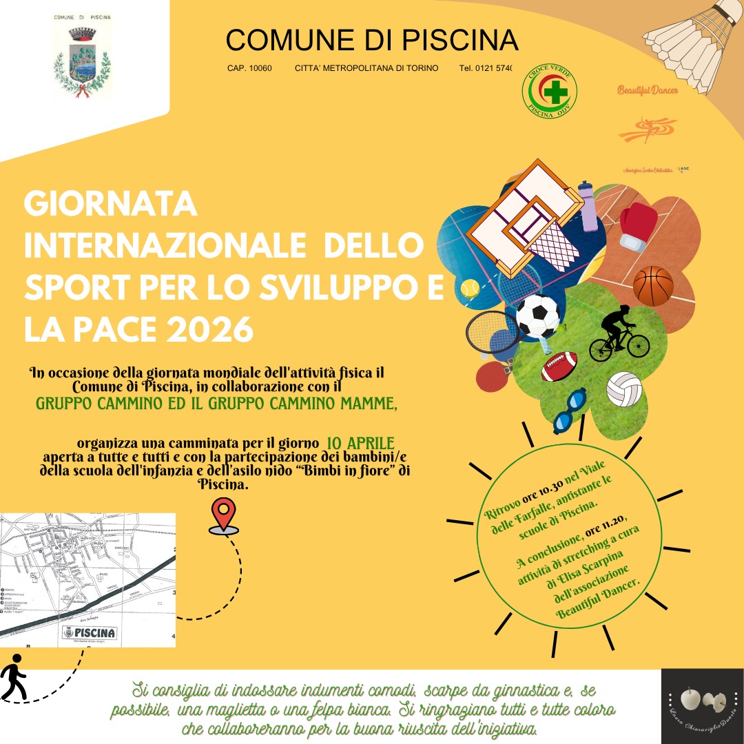 Il Comune di Piscina, in occasione della Giornata Internazionale dello Sport per lo Sviluppo e la Pace, organizza una camminata aperta a tutta la cittadinanza.