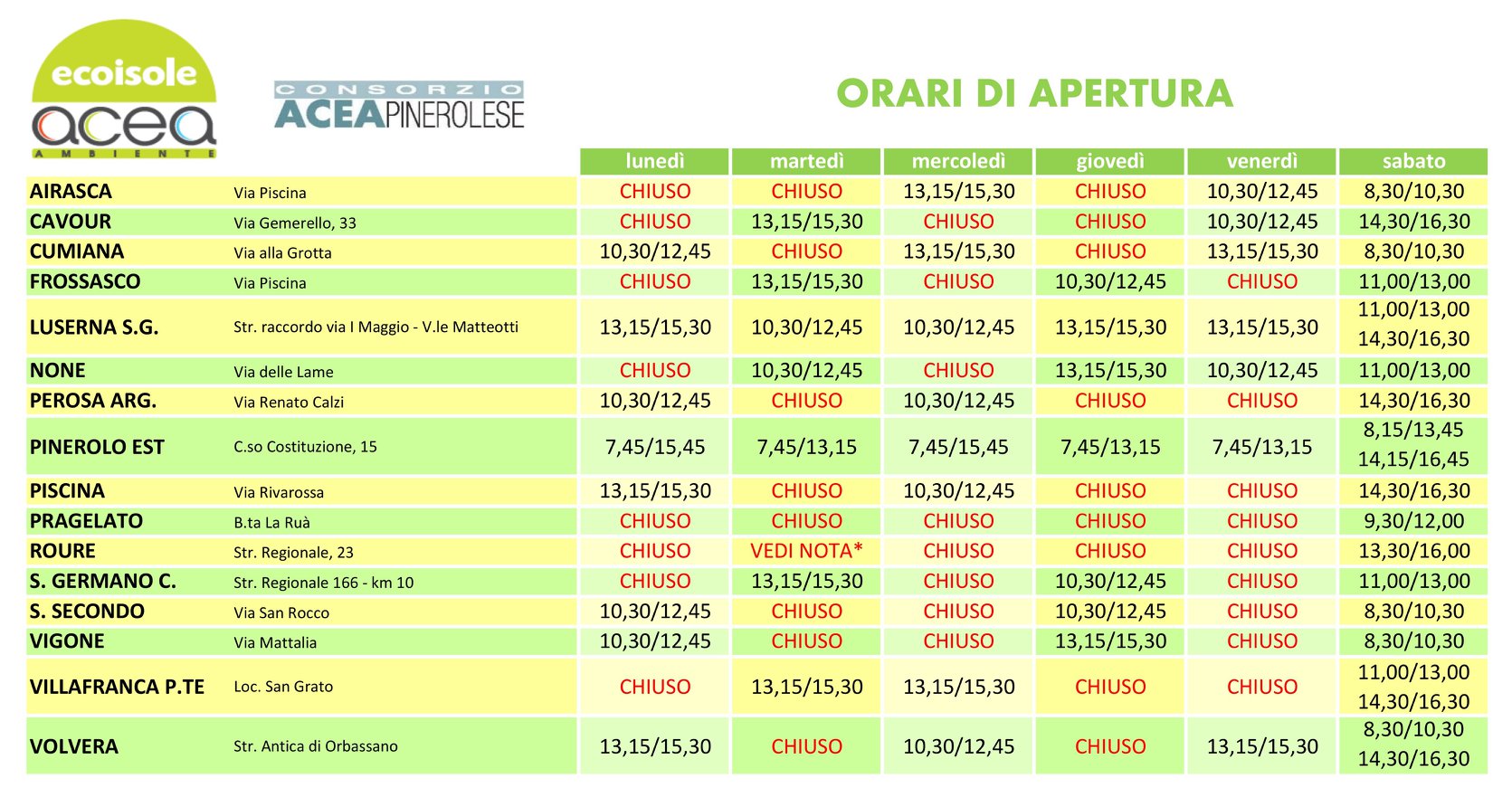 ORARI APERTURA ECOISOLA ACEA